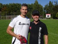 Ebenfalls vor dem letzten Heimspiel gegen den FV Eintracht Niesky, welches die FSV Kicker mit 3:1 (1:1) gewinnen konnten, zeichnete FSV Präsident Michael Förster (im Bild rechts) den besten Neusalzaer Torschützen der Saison 2024/2025 aus. Dies wurde mit 25 Saisontoren FSV Stürmer Marius Riedel (im Bild links), welcher nur zwei Treffer hinter Liga Torschützenkönig Nils Seyfert landete. Zudem steuerte der 30 jährige Angreifer in 27 Ligaspielen noch neun Torvorlagen bei und war damit an mehr als einem Drittel der 79 Neusalzaer Saisontore in der letzten Spielzeit beteiligt. Außerdem schraubte er den internen Neusalzaer Vereinsrekord der besten Saisontorschützen auf Landesebene von 16 auf 25 Treffer nach oben. Diesen hielt er gemeinsam mit Jan Řeháček selbst. In der Landesligasaison 2018/2019 erzielte er ebenso 16 Buden wie Jan Řeháček in der Landesklasse Ost Spielzeit 2014/2015. Übrigens war er nach der Auszeichnung im Derby gegen Niesky so angestachelt, dass er gleich an alle drei Treffern zum 3:1 Heimsieg beteiligt war und in dieser Spielzeit auch schon wieder sieben Saisontore in sieben Ligaspielen erzielte. (gs)