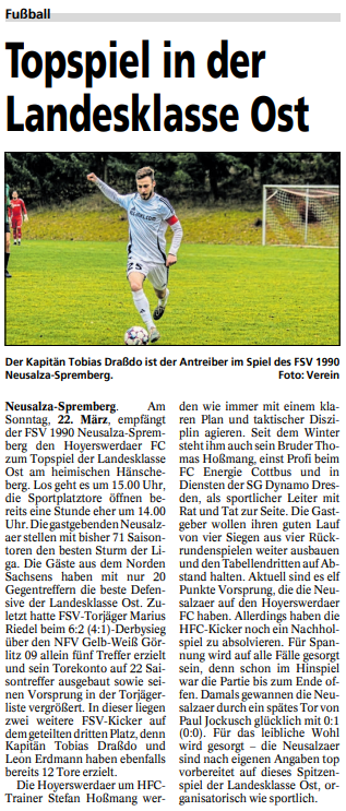 Am Hänscheberg in Neusalza-Spremberg kam es zum Topspiel des 20. Spieltags der Landesklasse Ost. Dazu empfingen die FSV Kicker den bisher Tabellendritten Hoyerswerdaer FC. Heimtrainer André Kohlschütter musste seine Startelf im Vergleich zur Vorwoche auf einer Position umbauen, da sich Filip Bareš kurzfristig krank meldete. So rückte der zuletzt gelbgesperrte David Haist wieder in die Startelf. Die Gäste traten ohne Martin Hoßmang, den Dreh- und Angelpunkt im HFC-Spiel, an. Vor 175 Zuschauern entwickelte sich ein temporeiches Landesklassenspiel. Bereits nach vier Minuten hatte FSV Torjäger Marius Riedel die Neusalzaer Führung auf dem Fuß, doch der Stürmer scheiterte nach einer Eingabe von Leon Erdmann an HFC Torwart Dominik Krüger (4.). Anschließend dominierten erst einmal die Defensivreihen in diesem intensiv, aber fair geführten Spiel. Die Offensivspieler beider Mannschaften versuchten sich jedoch immer wieder in Position zu bringen. So enteilte Gästespieler Alexander Seibt nach 29 Minuten den Neusalzaern und jagte den Ball aus vollem Lauf an die Latte (29.). In der Folge wechselten sich beide Mannschaften mit Großchancen ab. Neusalzas Marius Riedel scheiterte am Gästetorwart Dominik Krüger, und auch den Nachschuss bekamen die Gastgeber nicht am Schlussmann vorbei (33.). Auf der anderen Seite war FSV Keeper Dominic Schrining mit einer Fußparade gedankenschnell zur Stelle, als er einen Kopfball von Alexander Seibt parierte (36.). Im Hoyerswerdaer Strafraum eroberte Tobias Draßdo dann den Ball und tauchte frei vor dem Tor auf, doch anstatt selbst zu schießen, versuchte er es mit einem Abspiel, was misslang (41.). Die letzte Möglichkeit in diesem ausgeglichenen ersten Durchgang hatte erneut der beste Gästespieler, Alexander Seibt. Er versuchte sich wieder mit einem Kopfball, den Dominic Schrining im Neusalzaer Tor sensationell parierte (45.+1). Aus der Pause kamen die Platzherren wie angestachelt und entschieden dieses Spitzenspiel mit drei Toren binnen zehn Minuten. Nach einem robusten Zweikampf des Neusalzaers Leon Erdmann gegen HFC Kapitän Silvio Liebe, den der gut leitende Schiedsrichter Yanik Haenes aus Tharandt auch hätte abpfeifen können, bediente der FSV Kicker mit einem Pass in die Tiefe Marius Riedel, der den Ball im langen Eck unterbrachte (57.). Nur drei Minuten später bekamen die Gäste den Ball nicht geklärt. Paul Jockusch köpfte das Streitobjekt zurück in die Gefahrenzone, wo Louis Rudolph am schnellsten schaltete und mit Direktabnahme zum 2:0 traf (60.). Weitere sechs Minuten später setzte sich Leon Erdmann am linken Flügel durch und bediente Marius Riedel im Sturmzentrum, der abgeklärt zum 3:0 traf und den Deckel auf die Partie machte (66.). Kurz darauf verpasste Paul Jockusch aus sehr guter Position noch das vierte FSV Tor um Haaresbreite (67.). In der Schlussphase parierte der Hoyerswerdaer Torwart Dominik Krüger einen Freistoß von FSV Spielführer Tobias Draßdo (79.), und auch Gästespieler Alexander Seibt kam im Gegenzug nochmals aus recht guter Position zum Abschluss, verzog diesen jedoch (79.). In der 86. Minute hätte Leon Erdmann noch auf 4:0 erhöhen können, blieb bei seinem Solo aber am HFC Torhüter Dominik Krüger hängen. Damit fuhr der Tabellenführer aus Neusalza-Spremberg seinen insgesamt 15. Saisonsieg und den fünften Dreier in Folge ein und verabschiedet sich bestens gelaunt in die Osterpause. (gs)