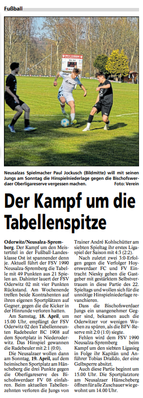 Bei nasskaltem Regenwetter empfing der FSV 1990 Neusalza-Spremberg die Oberligareserve des Bischofswerdaer FV 08 zum 22. Spieltag der Landesklasse Ost am Hänscheberg. Die Gastgeber mussten auf ihren etatmäßigen Kapitän Tobias Draßdo verzichten, welcher wegen einer Gelbsperre nach der fünften gelben Karte nur zuschauen konnte. Die Gastgeber erwarteten eine junge und unbekümmerte Bischofswerdaer Mannschaft, welche sich in der Folgezeit auch genauso präsentierte. Mutig und forsch versuchten die Gäste immer wieder, nach vorn zu kommen. Die erste gute Möglichkeit im Spiel hatten allerdings die Neusalzaer nach 18 Spielminuten. Paul Jockusch scheiterte aber mit einem direkten Freistoß am BFV Keeper Pascal Jentsch. Kurz darauf brachte Leon Erdmann den Ball steil vor das Bischofswerdaer Tor, wo Marius Riedel den Ball verpasste und das Spielgerät knapp am langen Pfosten vorbeistrich (21.). Dennoch waren die Mannen von Gästetrainer Miroslav Kalin die bessere Mannschaft im ersten Spielabschnitt. Auch sie verbuchten ihre erste gute Möglichkeit nach einem direkten Freistoß. Luca Elias Einenkel verfehlte das Dreiangel des Neusalzaer Tores nach exakt einer halben Stunde aber knapp (30.). Acht Minuten später versuchte sich erneut der Neusalzaer Paul Jockusch mit einem ruhenden Ball und zwang den Gästeschlussmann Pascal Jentsch erneut zu einer tollen Parade, als dieser den Freistoß mit einer Flugeinlage entschärfte (38.). Die 80 nassen Zuschauer hofften nach dieser ersten Halbzeit auf Besserung, welche nicht wirklich eintrat. Wie schon im ersten Spielabschnitt hatten die FSV Kicker die erste Möglichkeit. Einen von Marius Riedel durchgesteckten Ball erlief Louis Rudolph, welcher aber am aufmerksamen Pascal Jentsch im BFV Tor scheiterte (53.). Nach einer Jockusch Ecke wurde ein Kopfball von Jan Hybner in höchster Not abgeblockt (58.), und auch die folgenden Eckbälle verteidigte die BFV Reserve. Mit zunehmender Spielzeit agierten die Gastgeber zwar druckvoller, aber ohne dabei Durchschlagskraft zu entwickeln. Das eigene Spiel war an diesem Sonntagnachmittag zu fehlerbelastet. So lief man in der 71. Spielminute in einen kreuzgefährlichen Konter. Dabei marschierte Ben Michel in Richtung FSV Tor, aus welchem der Neusalzaer Schlussmann Dominic Schiring eilte und dem Bischofswerdaer den Ball vom Fuß grätschte. Kurz vor Spielende setzte derselbe BFV Akteur zu einem sehenswerten Sololauf über das halbe Spielfeld an, tauchte erneut frei vor dem Neusalzaer Tor auf und setzte den Ball knapp am Tor von Dominic Schiring vorbei (84.). In diesen Szenen hatte der Tabellenführer riesiges Glück, nicht in Rückstand geraten zu sein. In der 89. Minute erhöhte FSV Trainer André Kohlschütter etwas das Risiko, brachte Filip Bares für Pavel Frie, wandelte die Viererkette in eine Dreierkette um und beorderte den kopfballstarken Innenverteidiger Jan Hybner nach vorn. Zunächst jagte Paul Jockusch eine Eingabe vom eingewechselten Felix Julius auf das Dreieck des BFV Kastens, aber erneut war Pascal Jentsch zur Stelle und parierte sensationell (90.). Kurz darauf verteidigten die Bischofswerdaer Jungs eine Jockusch Ecke nur ungenügend, sodass der Ball erneut zum Schützen zurückkam und dieser erneut vor das BFV Tor flankte, wo Jan Hybner am höchsten stieg und doch noch zum umjubelten 1:0 einköpfte (90.+1). Mit seinem ersten Punktspieltor im Neusalzaer FSV Trikot sicherte der Sommerneuzugang dem FSV 1990 Neusalza-Spremberg ganz wichtige drei Zähler im Aufstiegsrennen. Dank der Oderwitzer 0:1 (0:1) Heimniederlage am Vortag gegen den Radebeuler BC 1908 und dem bestätigten Verbandsgerichtsurteil vom Freitag konnten die Kohlschütter Schützlinge ihren Vorsprung in der Tabelle auf sieben Punkte ausbauen. (gs)